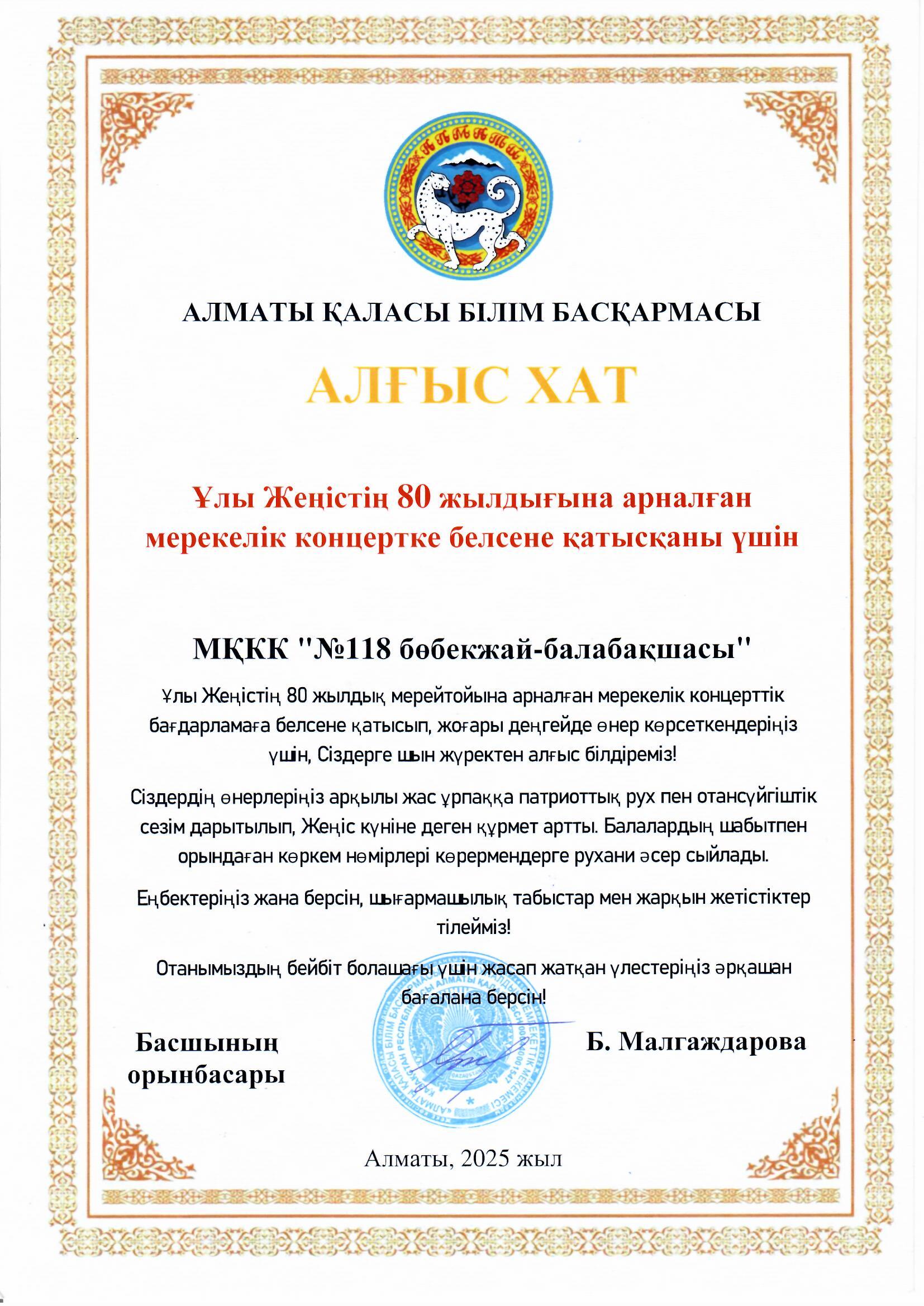 27 тамыз 2025 0 1 2 3 4 5 Ұлы Жеңістің 80 жылдығына арналған мерекелік концертке белсене қатысқаны үшін