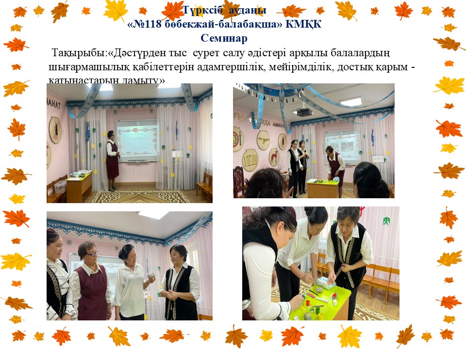 Семинар Тақырыбы: :«Дәстүрден тыс сурет салу әдістері арқылы балалардың шығармашылық қабілеттерін адамгершілік, мейірімділік, достық қарым -қатынастарын дамыту» » ГККП "Ясли сад №118"